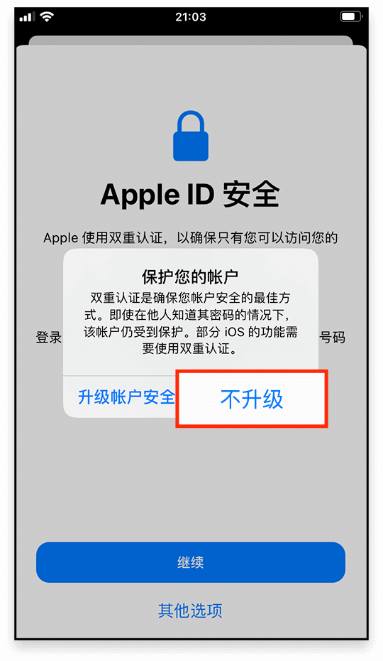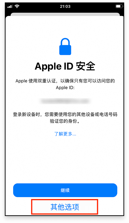 登录ID后,会弹出Apple ID安全页面,切记,请点击 <其他选项>,若没有此提示请忽略;
